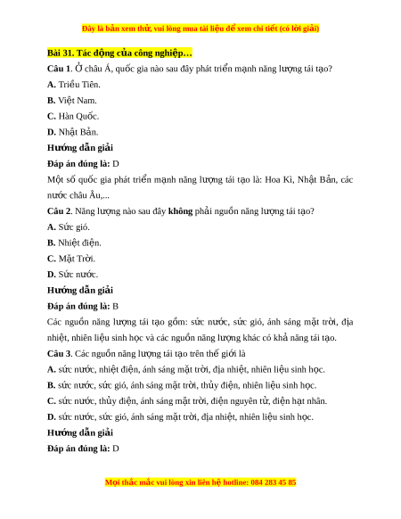 Câu 1. Ở châu Á, quốc gia nào sau đây phát tri n m ể nh năng ạ lư ng t ợ ái t o? ạ A. Tri u ề Tiên. B. Việt Nam. C. Hàn Quốc. D. Nh t ậ B n. ả Hư ng d ớ ẫn gi i ả Đáp án đúng là: D M t ộ số qu c ố gia phát tri n ể m nh ạ năng lư ng ợ tái t o ạ là: Hoa Kì, Nh t ậ B n, ả các nư c ớ châu Âu,...