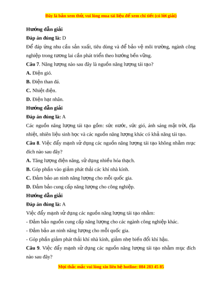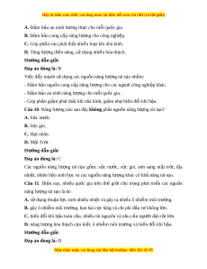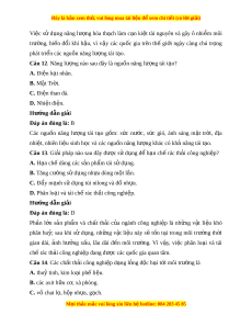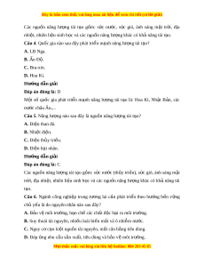 Câu 7. Năng lư ng nào s ợ au đây là ngu n năng l ồ ư ng t ợ ái t o? ạ A. Đi n gi ệ ó. B. Đi n t ệ han đá. C. Nhi t ệ đi n. ệ D. Đi n h ệ t ạ nhân. Hư ng d ớ ẫn gi i ả Đáp án đúng là: A Các ngu n ồ năng lư ng ợ tái t o ạ g m ồ : s c ứ nư c, ớ s c ứ gió, ánh sáng m t ặ tr i ờ , đ a ị nhiệt, nhiên li u s ệ inh h c ọ và các ngu n năng l ồ ư ng khác ợ có kh năng ả tái t o. ạ Câu 8. Vi c ệ đ y ẩ m nh ạ sử d ng ụ các ngu n ồ năng lư ng ợ tái t o ạ không nh m ằ m c ụ đích nào sau đây? A. Tăng lư ng đi ợ n năng, s ệ ử d ng nhi ụ u hóa t ề h ch. ạ