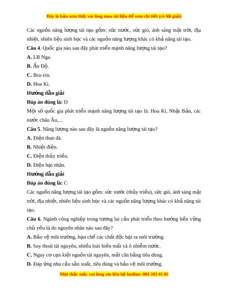 Câu 4. Quốc gia nào sau đây phát tri n m ể nh năng ạ lư ng t ợ ái t o? ạ A. LB Nga. B. n Đ Ấ . ộ C. Bra-xin. D. Hoa Kì. Hư ng d ớ ẫn gi i ả Đáp án đúng là: D M t ộ số qu c ố gia phát tri n ể m nh ạ năng lư ng ợ tái t o ạ là: Hoa Kì, Nh t ậ B n, ả các nư c ớ châu Âu,...