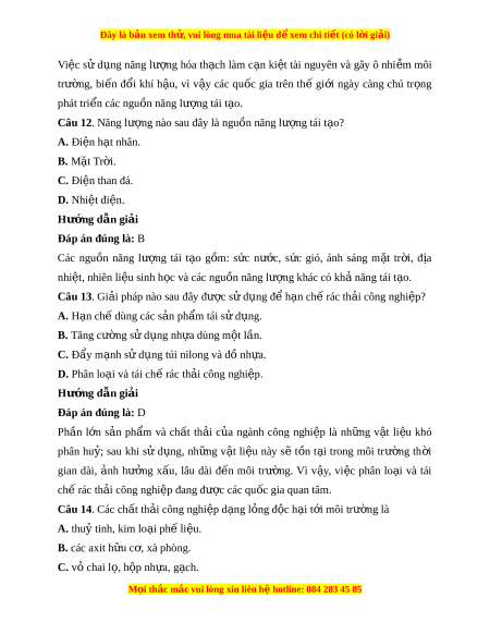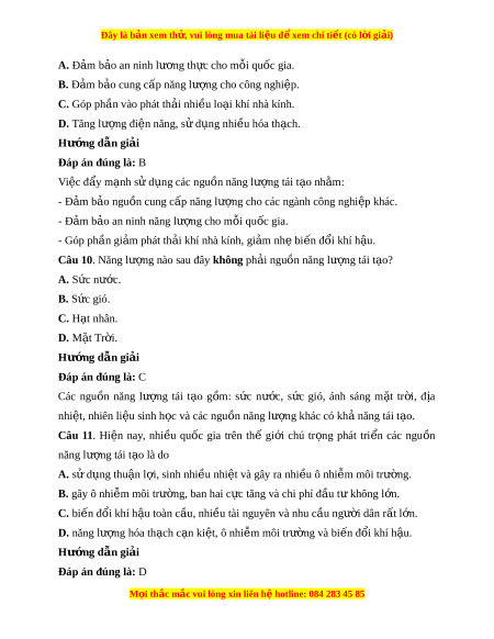 Câu 10. Năng lư ng nào s ợ au đây không ph i ả nguồn năng lư ng t ợ ái t o? ạ A. S c n ứ ước. B. S c gi ứ ó. C. H t ạ nhân. D. M t ặ Tr i ờ . Hư ng d ớ ẫn gi i ả Đáp án đúng là: C Các ngu n ồ năng lư ng ợ tái t o ạ g m ồ : s c ứ nư c, ớ s c ứ gió, ánh sáng m t ặ tr i ờ , đ a ị nhiệt, nhiên li u s ệ inh h c ọ và các ngu n năng l ồ ư ng khác ợ có kh năng ả tái t o. ạ Câu 11. Hi n ệ nay, nhi u ề qu c ố gia trên thế gi i ớ chú tr ng ọ phát tri n ể các ngu n ồ năng lư ng ợ tái t o l ạ à do A. sử d ng t ụ hu n ậ l i ợ , sinh nhi u nhi ề t ệ và gây ra nhi u ô nhi ề m ễ môi trư ng. ờ B. gây ô nhi m ễ môi trư ng, ờ ban hai c c t ự ăng và chi phí đ u t ầ ư không l n. ớ C. bi n đ ế ổi khí h u t ậ oàn cầu, nhi u t ề ài nguyên và nhu c u ng ầ ư i ờ dân r t ấ l n. ớ D. năng lư ng ợ hóa th ch ạ c n ki ạ t ệ , ô nhi m ễ môi trư ng ờ và bi n đ ế i ổ khí h u. ậ Hư ng d ớ ẫn gi i ả Đáp án đúng là: D M i