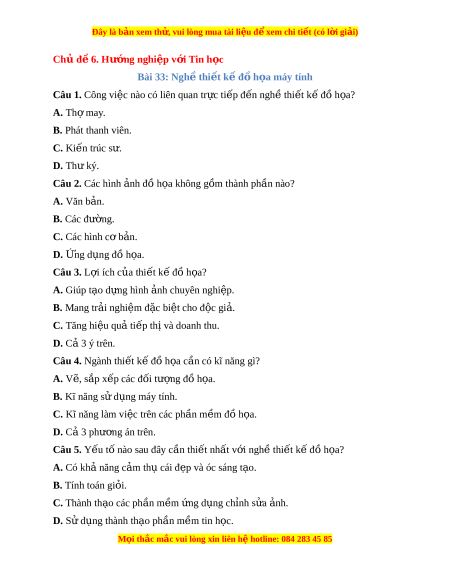 Đây là bản xem th , vu ử i lòng mua tài li u ệ đ xe ể m chi ti t (c ế ó l i ờ gi i ả ) Chủ đ 6. H ề ư ng ng ớ hi p v ệ i ớ Tin h c ọ Bài 33: Ngh t ề hi t ế k đ ế h ồ a m ọ áy tính Câu 1. Công vi c ệ nào có liên quan tr c t ự i p đ ế n ngh ế t ề hi t ế k đ ế h ồ a? ọ A. Th m ợ ay. B. Phát thanh viên. C. Ki n t ế rúc s . ư D. Th ký. ư