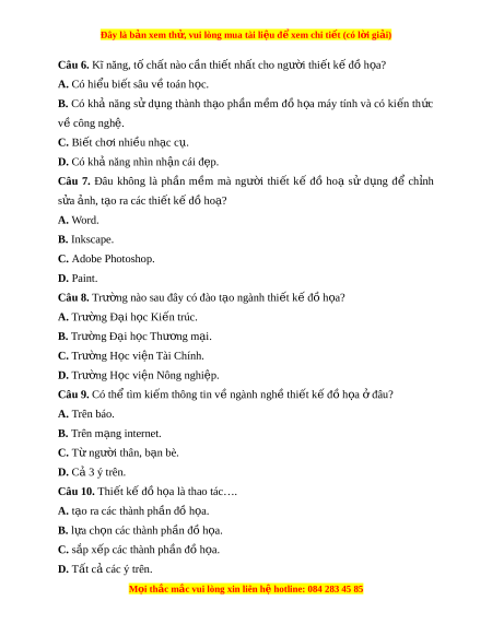 Câu 7. Đâu không là ph n ầ m m ề mà ngư i ờ thi t ế kế đồ hoạ sử d ng ụ để ch nh ỉ sửa nh, ả t o r ạ a các thi t ế k đ ế ho ồ ? ạ A. Word. B. Inkscape. C. Adobe Photoshop. D. Paint. Câu 8. Trư ng nào s ờ au đây có đào t o ạ ngành thi t ế k đ ế h ồ a? ọ A. Trư ng Đ ờ i ạ h c K ọ i n t ế rúc. B. Trư ng Đ ờ i ạ h c ọ Thư ng m ơ i ạ . C. Trư ng H ờ c ọ vi n ệ Tài Chính. D. Trư ng H ờ c ọ vi n N ệ ông nghi p. ệ Câu 9. Có th t ể ìm ki m ế thông tin v ngành ề ngh t ề hi t ế k đ ế h ồ a ọ đâu? ở A. Trên báo. B. Trên m ng ạ internet. C. T ng ừ ư i ờ thân, b n ạ bè. D. C 3 ý t ả rên. Câu 10. Thi t ế k đ ế ồ h a l ọ à thao tác…. A. t o ạ ra các thành ph n đ ầ h ồ a. ọ B. l a ch ự n các ọ thành ph n đ ầ ồ h a. ọ C. s p x ắ p các ế thành phần đồ h a. ọ D. T t ấ c các ả ý trên. M i