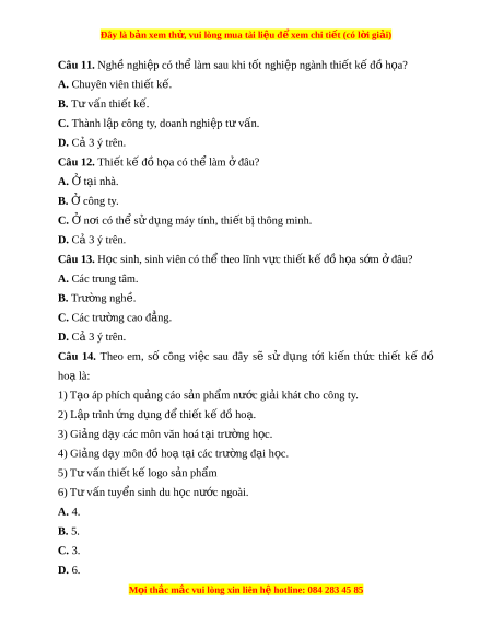 Câu 11. Nghề nghi p có t ệ hể làm sau khi t t ố nghi p ngành ệ thi t ế k đ ế h ồ a? ọ A. Chuyên viên thi t ế k . ế B. T v ư ấn thi t ế k . ế C. Thành l p công ậ ty, doanh nghi p t ệ v ư n. ấ D. C 3 ý t ả rên. Câu 12. Thi t ế k đ ế ồ h a có t ọ h l ể àm ở đâu? A. Ở t i ạ nhà. B. Ở công ty. C. Ở n i ơ có th s ể d ử ng m ụ áy tính, thi t ế b t ị hông minh. D. C 3 ý t ả rên. Câu 13. H c ọ sinh, sinh viên có th t ể heo lĩnh v c t ự hi t ế k đ ế h ồ a s ọ m ớ đâu? ở A. Các trung tâm. B. Trư ng ngh ờ . ề C. Các trư ng cao đ ờ ng. ẳ D. C 3 ý t ả rên.