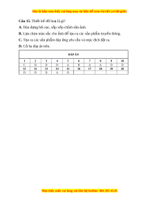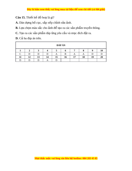 Đây là bản xem th , vu ử i lòng mua tài li u ệ đ xe ể m chi ti t (c ế ó l i ờ gi i ả ) Câu 15. Thi t ế k đ ế ồ ho l ạ à gì? A. Dàn d ng b ự ố c c, ụ s p ắ x p ch ế nh s ỉ a ử nh. ả B. L a ự ch n m ọ àu s c cho ắ nh ả đ t ể o ạ ra các s n ả ph m ẩ truy n t ề hông. C. T o r ạ a các s n ph ả ẩm đáp ng yêu c ứ ầu và m c ụ đích đ t ặ ra. D. C ba đáp ả án trên. ĐÁP ÁN 1 2 3 4 5 6 7 8 9 10 C D D D A B A A D D 11 12 13 14 15 16 17 18 19 20 D D D A D M i