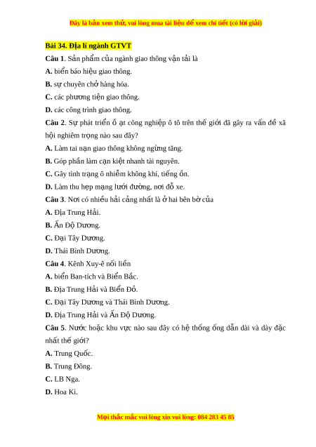 Đây là bản xem th , vu ử i lòng mua tài li u ệ đ xe ể m chi ti t ế (có l i ờ gi i ả ) Bài 34. Đ a l ị í ngành GTVT Câu 1. S n ph ả ẩm c a ngành gi ủ ao thông v n ậ t i ả là A. bi n báo hi ể ệu giao thông.
