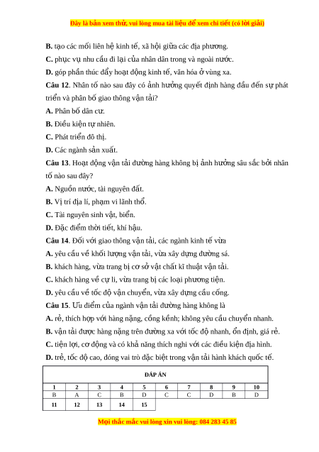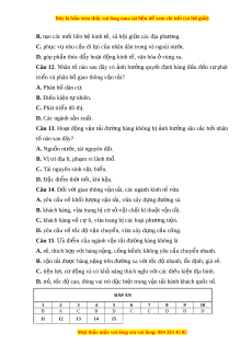C. Tài nguyên sinh v t ậ , bi n. ể D. Đ c ặ đi m ể th i ờ ti t ế , khí h u. ậ Câu 14. Đ i ố v i ớ giao thông v n t ậ i ả , các ngành kinh t v ế a ừ A. yêu cầu v kh ề ối lư ng v ợ n t ậ i ả , v a xây d ừ ng đ ự ư ng ờ sá. B. khách hàng, v a t ừ rang b c ị s ơ ở v t ậ ch t ấ kĩ thu t ậ v n ậ t i ả . C. khách hàng v c ề ự li, v a t ừ rang b các ị lo i ạ phư ng ơ ti n. ệ D. yêu cầu v t ề ốc đ v ộ n ậ chuy n, v ể a xây d ừ ng ự c u c ầ ống. Câu 15. u đi Ư m ể c a ngành v ủ n ậ t i ả đư ng ờ hàng không là A. rẻ, thích h p v ợ i ớ hàng n ng, c ặ ng k ồ nh; ề không yêu c u chuy ầ n ể nhanh. B. v n ậ t i ả đư c ợ hàng n ng t ặ rên đư ng xa ờ v i ớ t c ố đ nhanh, ộ n đ ổ nh, gi ị á r . ẻ C. ti n l ệ i ợ , c đ ơ ng và có ộ kh năng t ả hích nghi v i ớ các đi u ki ề n đ ệ a ị hình.