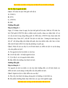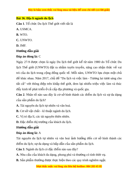 Đây là bản xem th , vu ử i lòng mua tài li u ệ đ xe ể m chi ti t (c ế ó l i ờ gi i ả ) Bài 36. Đ a l ị í ngành du l ch ị Câu 1. Tổ ch c D ứ u lịch Thế gi i ớ vi t ế t t ắ là A. USMCA. B. WTO. C. UNWTO. D. IMF. Hư ng d ớ ẫn gi i ả Đáp án đúng là: C Ngày 27-9 đư c ợ ch n ọ là ngày Du l ch ị thế gi i