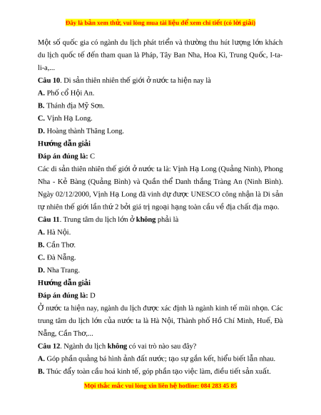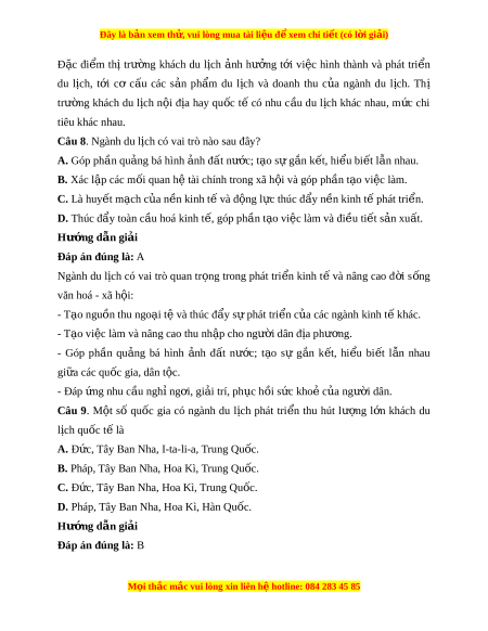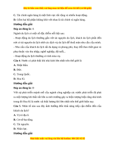 ệc làm và nâng cao thu nh p cho ậ ngư i ờ dân đ a ph ị ư ng. ơ - Góp ph n ầ qu ng ả bá hình nh ả đ t ấ nư c; ớ t o ạ sự g n ắ k t ế , hi u ể bi t ế l n ẫ nhau gi a ữ các quốc gia, dân t c. ộ - Đáp ng nhu c ứ u ngh ầ ng ỉ i ơ , gi i ả trí, ph c h ụ i ồ s c ứ kho c ẻ a ủ ngư i ờ dân. Câu 9. M t ộ số qu c ố gia có ngành du l ch ị phát tri n ể thu hút lư ng ợ l n ớ khách du lịch quốc t l ế à A. Đ c,