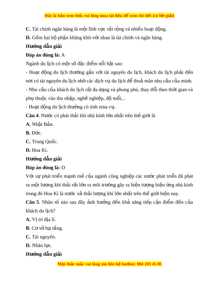 ớ nhau là tài chính và ngân hàng. Hư ng d ớ ẫn gi i ả Đáp án đúng là: A Ngành du lịch có m t ộ số đ c đi ặ m ể nổi b t ậ sau: - Ho t ạ đ ng ộ du l ch ị thư ng ờ g n ắ v i ớ tài nguyên du l ch, ị khách du l ch ị ph i ả đ n ế n i ơ có tài nguyên du l ch ị nh các d ờ ch v ị du l ụ ch đ ị t ể ho m ả ãn nhu c u c ầ a m ủ ình. - Nhu c u ầ c a ủ khách du l ch ị r t ấ đa d ng ạ và phong phú, thay đ i ổ theo th i ờ gian và ph t ụ hu c ộ vào thu nh p, ngh ậ ề nghi p, đ ệ ộ tu i ổ ,.. - Ho t ạ đ ng ộ du l ch t ị hư ng ờ có tính mùa v . ụ Câu 4. Nư c ớ có phát th i ả khí nhà kính l n nh ớ t ấ trên th gi ế i ớ là A. Nh t ậ B n. ả B. Đ c. ứ C. Trung Quốc. D. Hoa Kì. Hư ng d ớ ẫn gi i ả Đáp án đúng là: D V i ớ sự phát tri n ể m nh ạ mẽ c a ủ ngành công nghi p ệ các nư c ớ phát tri n ể đã phát ra m t ộ lư ng ợ khí th i ả r t ấ l n ớ ra môi trư ng ờ gây ra hi n ệ tư ng ợ hi u ệ ng ứ nhà kính trong đó Hoa Kì là nư c ớ x t ả h i ả lư ng khí ợ l n nh ớ t ấ trên th gi ế i ớ hi n nay ệ .
