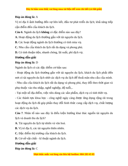 Đây là bản xem th , vu ử i lòng mua tài li u ệ đ xe ể m chi ti t (c ế ó l i ờ gi i ả ) Đáp án đúng là: A Vị trí đ a ị lí nh ả hư ng ở đ n ế sự liên k t ế , đ u ầ tư phát tri n ể du l ch; ị kh ả năng ti p ế c n ậ đi m ể đ n c ế a ủ khách du l ch. ị