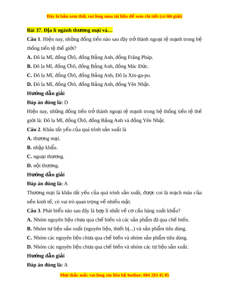 Đây là bản xem th , vu ử i lòng mua tài li u ệ đ xe ể m chi ti t (c ế ó l i ờ gi i ả ) Bài 37. Đ a l ị í ngành thư ng ơ m i ạ và… Câu 1. Hi n ệ nay, nh ng ữ đ ng ồ ti n ề nào sau đây tr ở thành ngo i ạ t ệ m nh ạ trong hệ thống ti n t ề t ệ h gi ế i ớ ? A. Đô la Mĩ, đ ng ồ r Ơ ô, đ ng B ồ ng ả Anh, đ ng Fr ồ ăng Pháp.