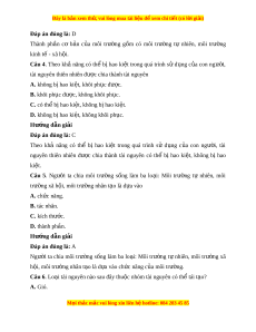 ợ chia thành tài nguyên có thể bị hao ki t ệ , không bị hao kiệt. Câu 5. Ngư i ờ ta chia môi trư ng ờ s ng ố làm ba lo i ạ : Môi trư ng ờ tự nhiên, môi trư ng xã h ờ i ộ , môi trư ng nhân t ờ o ạ là d a vào ự A. ch c ứ năng. B. tác nhân. C. kích thư c. ớ D. thành phần. Hư ng d ớ ẫn gi i ả Đáp án đúng là: A Ngư i ờ ta chia môi trư ng ờ s ng ố làm ba lo i ạ : Môi trư ng ờ t ự nhiên, môi trư ng ờ xã h i ộ , môi trư ng nhân t ờ o ạ là d a vào ch ự c ứ năng c a ủ môi trư ng. ờ Câu 6. Lo i