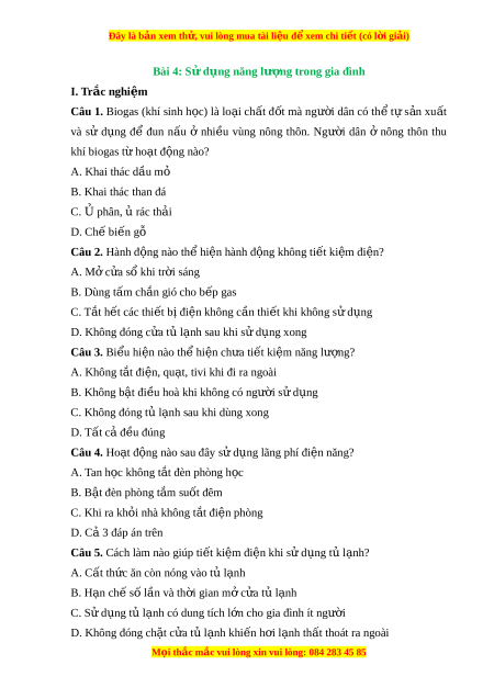Đây là bản xem th , vu ử i lòng mua tài li u ệ đ xe ể m chi ti t ế (có l i ờ gi i ả ) Bài 4: S d ử ng năng l ụ ư ng t ợ rong gia đình I. Trắc nghi m ệ