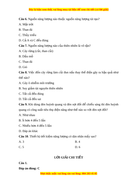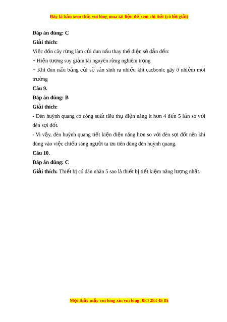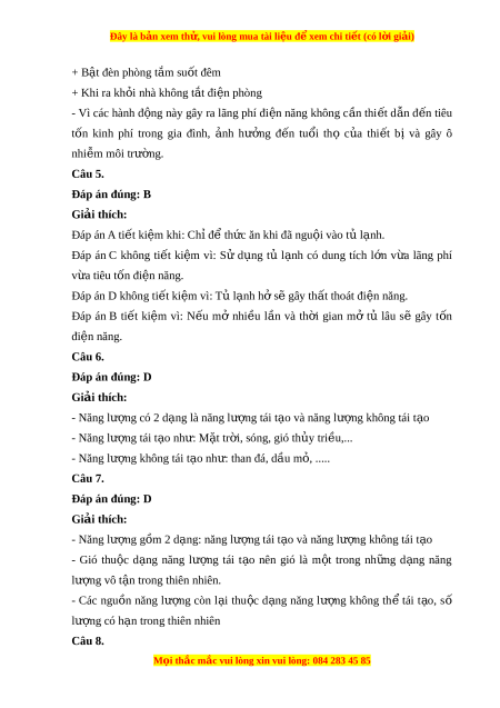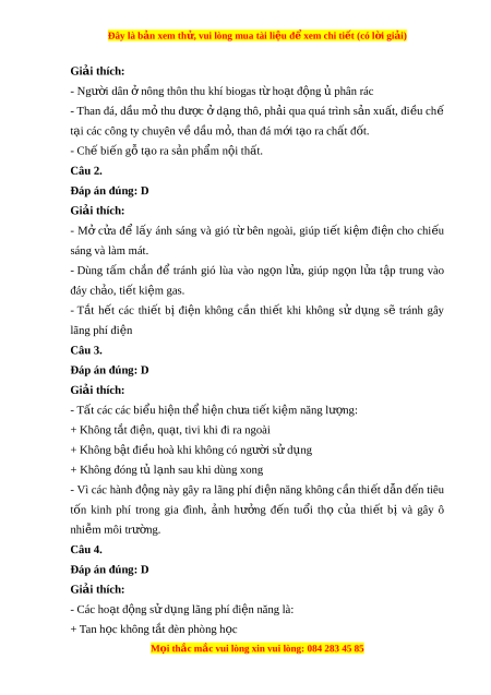 Đây là bản xem th , vu ử i lòng mua tài li u ệ đ xe ể m chi ti t ế (có l i ờ gi i ả ) Giải thích: - Ngư i ờ dân nông t ở hôn thu khí biogas t ho ừ t ạ đ ng ộ phân ủ rác - Than đá, d u ầ m ỏ thu đư c ợ d ở ng ạ thô, ph i ả qua quá trình s n ả xu t ấ , đi u ề chế t i ạ các công ty chuyên v d ề u m ầ , t ỏ han đá m i ớ t o ạ ra ch t ấ đ t ố . - Chế bi n g ế ỗ t o r ạ a s n ả ph m ẩ n i ộ th t ấ . Câu 2. Đáp án đúng: D Giải thích: - Mở c a ử để l y