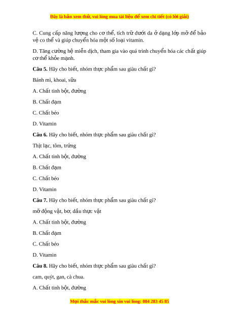 tham gia vào quá trình chuy n ể hóa các ch t ấ giúp c t ơ h kh ể e ỏ m nh. ạ Câu 5. Hãy cho bi t ế , nhóm th c ph ự m ẩ sau giàu ch t ấ gì? Bánh mì, khoai, sữa A. Chất tinh b t ộ , đư ng ờ B. Chất đ m ạ C. Chất béo D. Vitamin Câu 6. Hãy cho bi t ế , nhóm th c ph ự m ẩ sau giàu ch t ấ gì? Thịt l c, ạ tôm, tr ng ứ A. Chất tinh b t ộ , đư ng ờ B. Chất đ m ạ C. Chất béo D. Vitamin Câu 7. Hãy cho bi t ế , nhóm th c ph ự m ẩ sau giàu ch t ấ gì? m đ ỡ ng v ộ t ậ , b , d ơ u t ầ h c v ự t ậ A. Chất tinh b t ộ , đư ng ờ B. Chất đ m ạ C. Chất béo D. Vitamin Câu 8. Hãy cho bi t ế , nhóm th c ph ự m ẩ sau giàu ch t ấ gì? cam, quýt, gan, cà chua. A. Chất tinh b t ộ , đư ng ờ M i