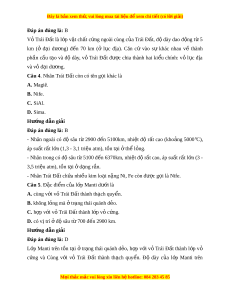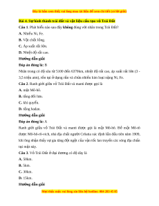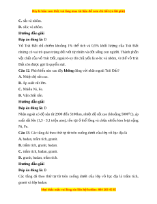 au đây không đúng v i ớ nhân trong Trái Đất? A. Nhi u N ề i, Fe. B. V t ậ chất l ng. ỏ C. Áp suất r t ấ l n. ớ D. Nhi t ệ đ r ộ ất cao. Hư ng d ớ ẫn gi i ả Đáp án đúng là: B Nhân trong có độ sâu t ừ 5100 đ n ế 6370km, nhi t ệ đ ộ r t ấ cao, áp su t ấ r t ấ l n ớ (3 - 3,5 tri u at ệ m), t n t ồ i ạ d ở ng ạ r n và ch ắ a ứ nhi u ề kim lo i ạ n ng N ặ i, Fe. Câu 2. Ranh gi i ớ gi a v ữ ỏ Trái Đ t ấ và manti đư c ợ g i ọ là A. m t ặ Mô-hô. B. tầng đối l u. ư C. khí quy n. ể D. tầng badan. Hư ng d ớ ẫn gi i ả Đáp án đúng là: A Ranh gi i ớ gi a ữ vỏ Trái Đ t ấ và manti đư c ợ g i ọ là m t ặ Mô-hô. Bề m t ặ Mô-tô đư c