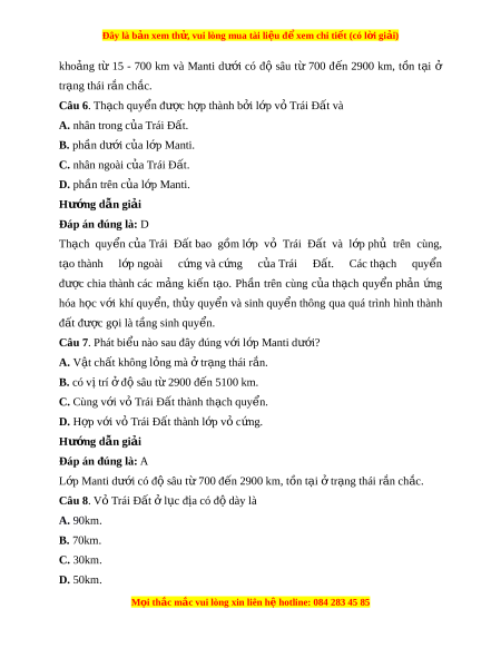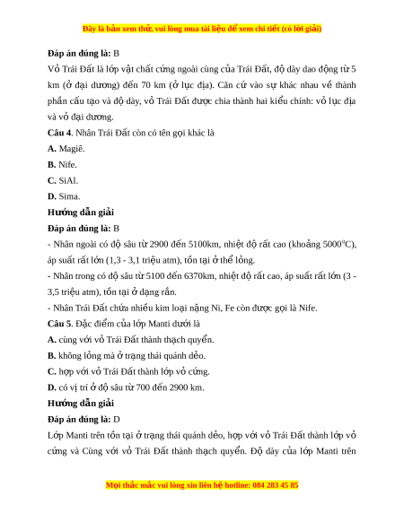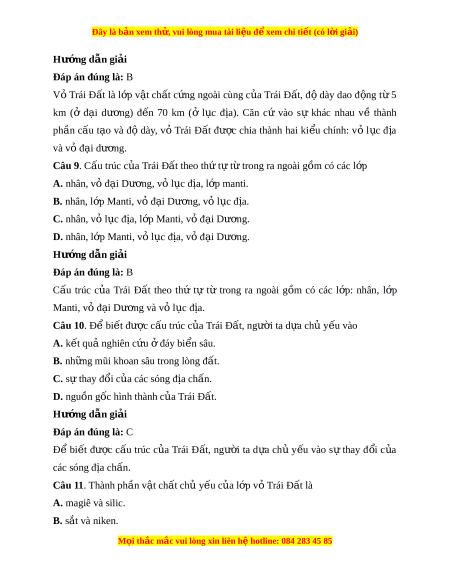 Đây là bản xem th , vu ử i lòng mua tài li u ệ đ xe ể m chi ti t (c ế ó l i ờ gi i ả ) Đáp án đúng là: B Vỏ Trái Đất là l p ớ v t ậ ch t ấ c ng ứ ngoài cùng c a ủ Trái Đ t ấ , đ ộ dày dao đ ng ộ t ừ 5 km (ở đ i ạ dư ng) ơ đ n ế 70 km (ở l c ụ đ a)