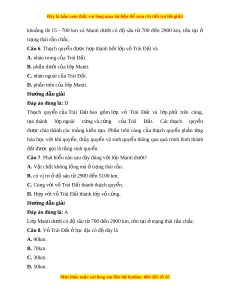 Câu 7. Phát bi u nào s ể au đây đúng v i ớ l p ớ Manti dư i ớ ? A. V t ậ chất không l ng m ỏ à t ở r ng t ạ hái r n. ắ B. có vị trí đ ở ộ sâu t 2900 đ ừ n ế 5100 km. C. Cùng v i ớ v ỏ Trái Đ t ấ thành th ch quy ạ n. ể D. H p ợ v i ớ v ỏ Trái Đ t ấ thành l p v ớ c ỏ ng. ứ Hư ng d ớ ẫn gi i ả Đáp án đúng là: A L p M ớ anti dư i ớ có đ s ộ âu t 700 đ ừ n 2900 km ế , t n t ồ i ạ t ở r ng t ạ hái r n ch ắ c. ắ Câu 8. V ỏ Trái Đ t ấ l ở c đ ụ a có đ ị dày ộ là A. 90km. B. 70km. C. 30km. D. 50km. M i