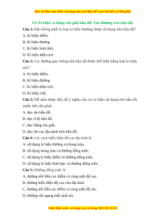 Câu 1: Đâu không ph i ả là lo i ạ kí hi u t ệ hư ng ờ đư c s ợ ử d ng t ụ rên b n đ ả ? ồ A. Kí hi u đ ệ i m ể . B. Kí hi u đ ệ ư ng. ờ C. Kí hi u hì ệ nh nh. ả D. Kí hi u d ệ i n t ệ ích. Câu 2: Các đư ng gi ờ ao thông trên b n ả đ đ ồ ư c ợ th hi ể n b ệ ng l ằ o i ạ kí hi u ệ nào? A. Kí hi u đ ệ i m ể . B. Kí hi u đ ệ ư ng. ờ C. Kí hi u di ệ n t ệ ích. D. Kí hi u ch ệ . ữ Câu 3: Để n m ắ đư c ợ đầy đ ý nghĩ ủ a c a các ủ kí hi u s ệ ử d ng t ụ rên b n đ ả , ồ trư c ớ h t ế c n ph ầ i ả A. đ c t ọ ên b n ả đồ. B. đ c ọ tỉ lệ b n ả đồ. C. đ c ọ b ng chú gi ả i ả . D. đ c t ọ ên các đ a danh t ị rên b n đ ả . ồ Câu 4: Các cách bi u ể hi n đ ệ ộ cao đ a hì ị nh là A. s d ử ng ụ kí hi u đ ệ ư ng ờ và thang màu. B. sử d ng t ụ hang màu và đư ng ờ đồng m c. ứ C. sử d ng kí ụ hiệu đi m ể và đư ng đ ờ ồng m c. ứ D. s d ử ng ụ kí hi u hì ệ nh h c ọ và đư ng đ ờ ng m ồ c. ứ Câu 5: Đư ng ờ đồng m c ứ là A. đư ng n ờ ối li n các đi ề m ể có cùng m t ộ đ cao. ộ B. đư ng ờ bi u di ể n đ ễ cao c ộ a ủ đ a hì ị nh. C. đư ng ờ nối li n các ề đi m ể có cùng m t ộ đ s ộ âu. D. đư ng c ờ t ắ ngang m t ộ quả núi. M i