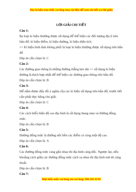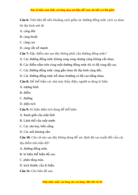 Đây là bản xem th , vu ử i lòng mua tài li u ệ đ xe ể m chi ti t ế (có l i ờ gi i ả ) Câu 6: Trên b n đ ả ồ n u kho ế ng cách ả gi a các ữ đư ng đ ờ ồng m c cách ứ xa nhau thì đ a ị hình n i ơ đó A. càng dốc B. càng tho i ả C. càng cao D. càng c t ắ xẻ m nh ạ Câu 7: Đặc đi m