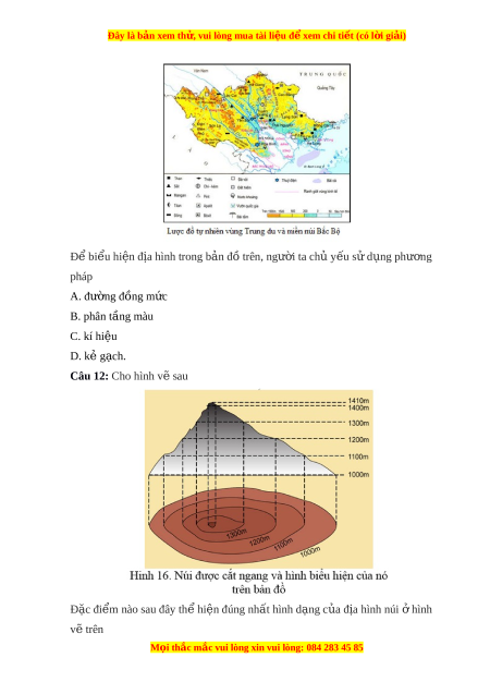 Đây là bản xem th , vu ử i lòng mua tài li u ệ đ xe ể m chi ti t ế (có l i ờ gi i ả ) Đ bi ể u hi ể ện địa hình trong b n ả đ t ồ rên, ngư i ờ ta ch y ủ u s ế d ử ng ph ụ ư ng ơ pháp A. đư ng đ ờ ồng m c ứ B. phân tầng màu C. kí hi u ệ D. kẻ g ch. ạ Câu 12: Cho hình v s ẽ au Đ c ặ đi m