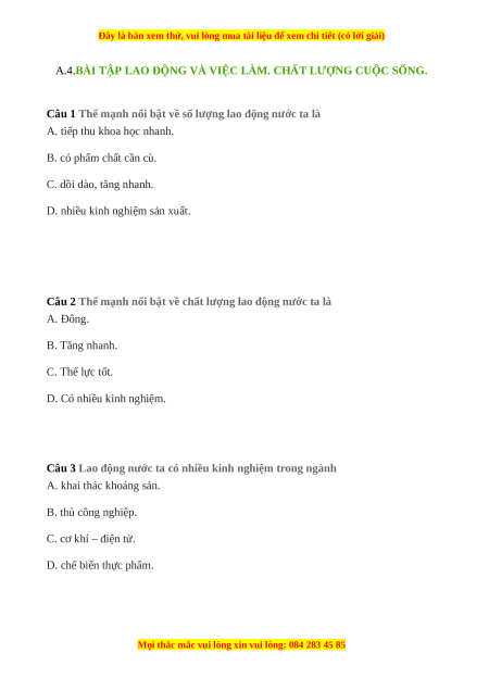 A.4.BÀI TẬP LAO ĐỘNG VÀ VIỆC LÀM. CHẤT LƯỢNG CUỘC SỐNG.