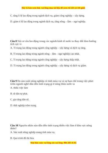 Câu 10 Nguyên nhân nào dẫn đến tình trạng thiếu việc làm ở khu vực nông