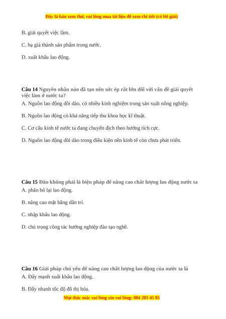 Câu 13 Trong điều kiện nền kinh tế nước ta chưa phát triển, nguồn lao động