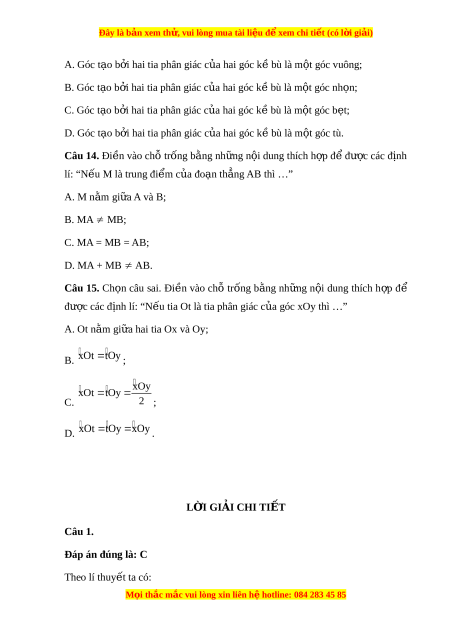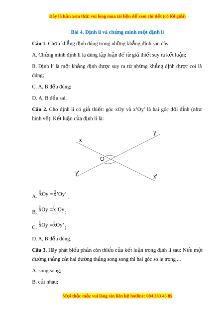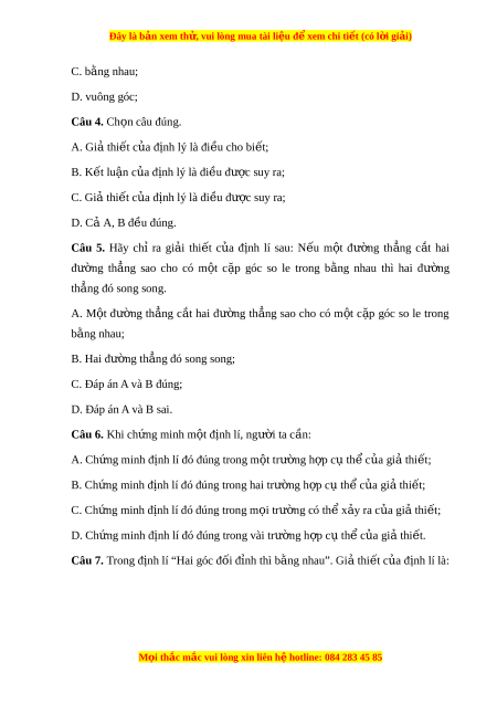 Đây là bản xem th , vu ử i lòng mua tài li u ệ đ xe ể m chi ti t ế (có l i ờ gi i ả ) C. b ng ằ nhau; D. vuông góc; Câu 4. Ch n câu ọ đúng. A. Gi t ả hi t ế c a ủ đ nh l ị ý là đi u ề cho bi t ế ; B. K t ế lu n ậ c a đ ủ nh l ị ý là đi u đ ề ư c ợ suy ra; C. Giả thi t ế c a đ ủ nh l ị ý là đi u đ ề ư c ợ suy ra; D. Cả A, B đ u ề đúng.