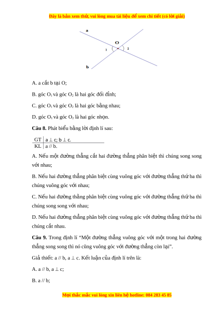 Đây là bản xem th , vu ử i lòng mua tài li u ệ đ xe ể m chi ti t ế (có l i ờ gi i ả ) C. b c; D. a // b, a c, b c. Câu 10. Đi n vào ch ề ỗ chấm ph n k ầ t ế lu n đ ậ hoàn t ể hành đ nh l ị í sau: N u ế m t ộ đư ng ờ th ng ẳ c t ắ hai đư ng ờ th ng