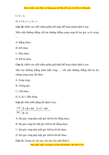 ẳ song song thì hai góc so le trong … A. B ng ằ nhau; B. K nhau; ề C. Ph nhau; ụ D. K bù nhau. ề Câu 11. Đi n vào ề chỗ ch m ấ ph n gi ầ t ả hi t ế để hoàn thành đ nh l ị í sau: N u ế hai đư ng ờ th ng ẳ phân bi t ệ cùng … v i ớ m t ộ đư ng ờ th ng ẳ thứ ba thì chúng song song v i ớ nhau. A. Song song; B. Vuông góc; C. C t ắ nhau; D. A, B, C đ u đúng. ề Câu 12. Phát bi u b ể ng l ằ i ờ đ nh l ị í sau: GT o A B 9 0 ; o A C 9 0 KL B C . A. Hai góc cùng phụ m t ộ góc th ba t ứ hì b ng nhau ằ ; B. Hai góc cùng bù m t ộ góc th ba t ứ hì b ng ằ nhau; C. Hai góc cùng ph m ụ t ộ góc th ba t ứ hì bù nhau; D. Hai góc cùng ph m ụ t ộ góc th ba t ứ hì k nhau ề .