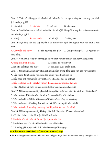 Câu 18: Nội dung nào sau đây không phản ánh đúng đặc điểm của văn minh?