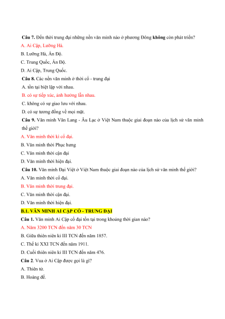 Câu 6. Đến thời trung đại những nền văn minh nào ở phương Đông tiếp tục phát triển? A. Ai Cập, Lưỡng Hà. B. Lưỡng Hà, Ấn Độ. C. Trung Quốc, Ấn Độ. D. Ai Cập, Trung Quốc.