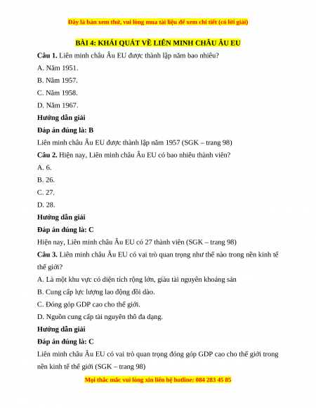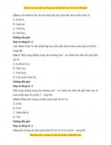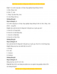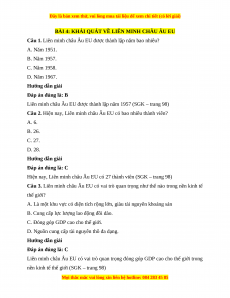 Câu 1. Liên minh châu Âu EU được thành lập năm bao nhiêu? A. Năm 1951. B. Năm 1957. C. Năm 1958. D. Năm 1967. Hướng dẫn giải Đáp án đúng là: B