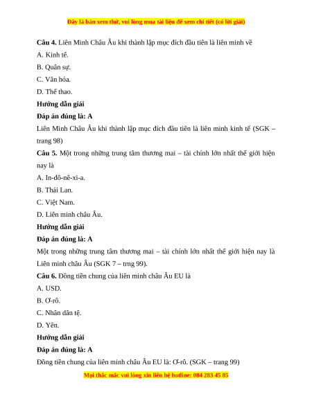 Câu 6. Đồng tiền chung của liên minh châu Âu EU là A. USD. B. Ơ-rô. C. Nhân dân tệ. D. Yên. Hướng dẫn giải Đáp án đúng là: A