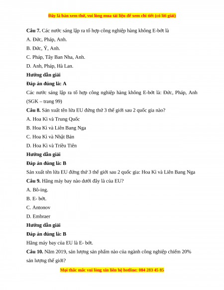 Câu 12. Tổ hợp công nghiệp hàng không E-Bớt có trụ sở đặt ở A. Anh. B. Đức. C. Pháp. D. Thụy Điển Hướng dẫn giải Đáp án đúng là: C