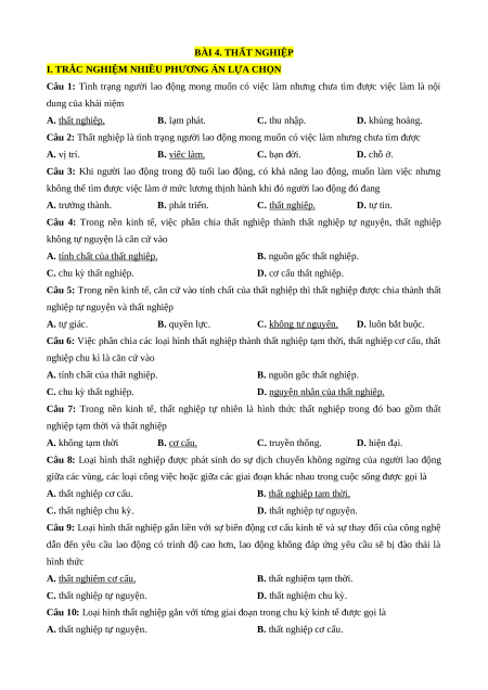 Câu 1: Tình trạng người lao động mong muốn có việc làm nhưng chưa tìm được việc làm là nội dung của khái niệm A. thất nghiệp. B. lạm phát. C. thu nhập. D. khủng hoảng.