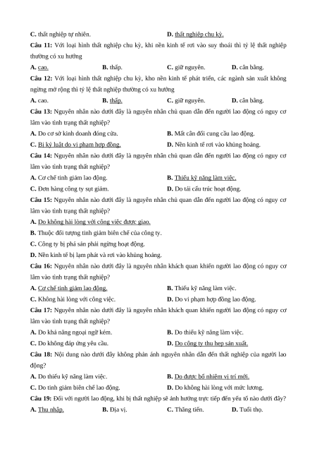 Câu 11: Với loại hình thất nghiệp chu kỳ, khi nền kinh tế rơi vào suy thoái thì tỷ lệ thất nghiệp thường có xu hướng A. cao. B. thấp. C. giữ nguyên. D. cân bằng.