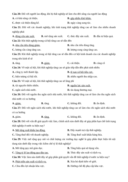 Câu 21: Đối với các doanh nghiệp, khi tình trạng thất nghiệp tăng cao sẽ làm cho nhiều doanh nghiệp phải