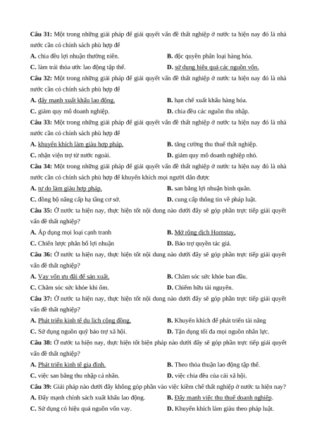 Câu 33: Một trong những giải pháp để giải quyết vấn đề thất nghiệp ở nước ta hiện nay đó là nhà