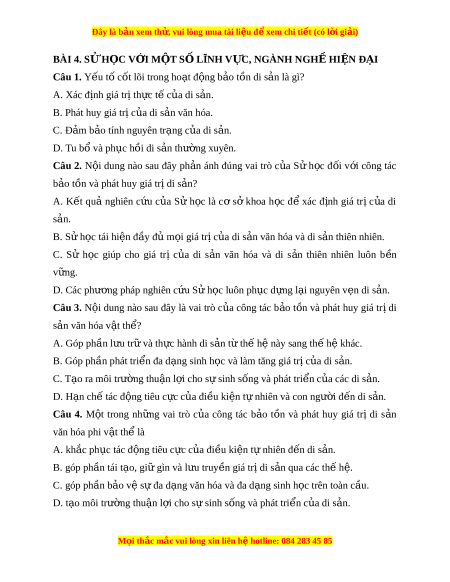Đây là bản xem th , vu ử i lòng mua tài li u ệ đ xe ể m chi ti t (c ế ó l i ờ gi i ả ) BÀI 4. S H Ử C Ọ V I Ớ M T Ộ S L Ố ĨNH V C Ự , NGÀNH NGH H Ề I N Ệ Đ I Ạ Câu 1. Y u ế tố cốt lõi trong ho t ạ đ ng b ộ o t ả n di ồ s n ả là gì? A. Xác đ nh g ị iá tr t ị h c t ự c ế a ủ di s n. ả B. Phát huy giá tr c ị a di ủ s n văn ả hóa. C. Đ m ả b o ả tính nguyên tr ng ạ c a di ủ s n. ả D. Tu bổ và ph c ụ hồi di s n t ả hư ng xuyên. ờ Câu 2. N i ộ dung nào sau đây ph n ả ánh đúng vai trò c a ủ S ử h c ọ đ i ố v i ớ công tác b o