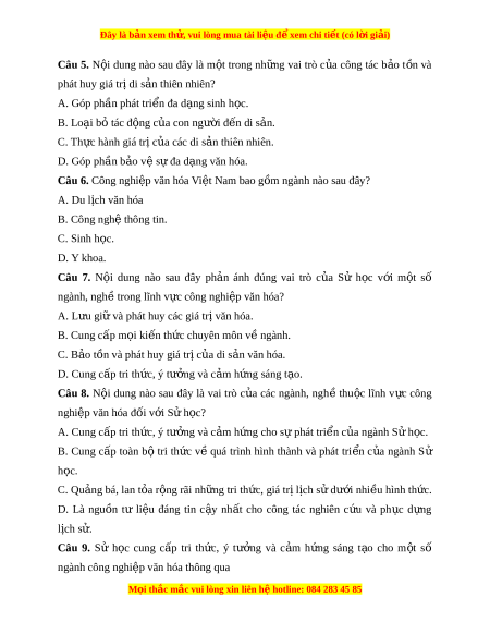 ồ và phát huy giá tr ịdi s n văn hóa ả v t ậ th ? ể A. Góp phần l u t ư r và t ữ h c hành ự di s n t ả ừ thế h này ệ sang th h ế khác. ệ B. Góp ph n phát ầ tri n đa d ể ng ạ sinh h c ọ và làm tăng giá tr c ị a ủ di s n. ả C. T o r ạ a môi trư ng ờ thu n l ậ i ợ cho s s ự inh s ng ố và phát tri n c ể a ủ các di s n. ả D. H n ạ ch t ế ác đ ng t ộ iêu c c c ự a ủ đi u ki ề n t ệ nhi ự ên và con ngư i ờ đ n ế di s n. ả Câu 4. M t ộ trong nh ng ữ vai trò c a ủ công tác b o ả t n