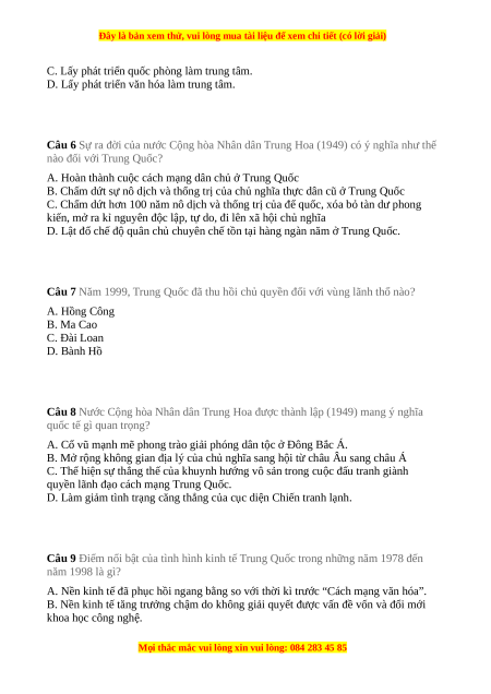 Câu 7 Năm 1999, Trung Quốc đã thu hồi chủ quyền đối với vùng lãnh thổ nào? A. Hồng Công B. Ma Cao C. Đài Loan D. Bành Hồ