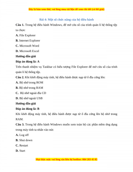 Câu 1. Trong hệ điều hành Windows, để mở cửa sổ của trình quản lí hệ thống tệp ta chọn: A. File Explorer B. Internet Explorer C. Microsoft Word D. Microsoft Excel Hướng dẫn giải