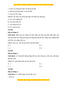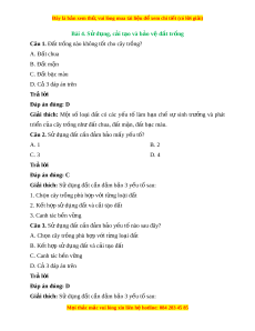 Câu 1. Đất trồng nào không tốt cho cây trồng? A. Đất chua B. Đ t ấ m n ặ C. Đ t ấ bạc màu D. C 3 đáp án ả trên Trả l i ờ Đáp án đúng: D Giải thích: M t ộ số lo i ạ đ t ấ có các y u ế tố làm h n ạ chế sự sinh trư ng ở và phát tri n c ể a cây ủ trồng nh đ ư t ấ chua, đ t ấ m n, đ ặ t ấ b c m ạ àu. Câu 2. S d ử ng đ ụ ất c n đ ầ m ả b o ả m y y ấ u t ế ? ố A. 1 B. 2 C. 3 D. 4 Trả l i ờ Đáp án đúng: C Giải thích: S d ử ng đ ụ ất c n đ ầ m ả b o 3 y ả u ế t s ố au: 1. Ch n ọ cây trồng phù h p ợ v i ớ t ng l ừ o i ạ đ t ấ 2. K t ế h p ợ s d ử ng ụ đ t ấ và c i ả t o đ ạ t ấ 3. Canh tác b n v ề ng ữ Câu 3. S d ử ng đ ụ ất c n đ ầ m ả b o ả y u t ế nào s ố au đây? A. Ch n cây t ọ rồng phù h p v ợ i ớ t ng l ừ o i ạ đ t ấ B. K t ế h p s ợ ử d ng đ ụ t ấ và c i ả t o ạ đ t ấ C. Canh tác b n v ề ng ữ D. C 3 đáp án ả trên Trả l i ờ Đáp án đúng: D Giải thích: S d ử ng đ ụ ất c n đ ầ m ả b o 3 y ả u ế t s ố au: M i
