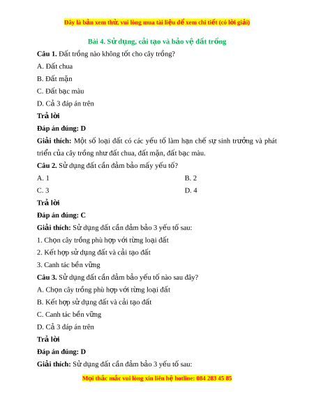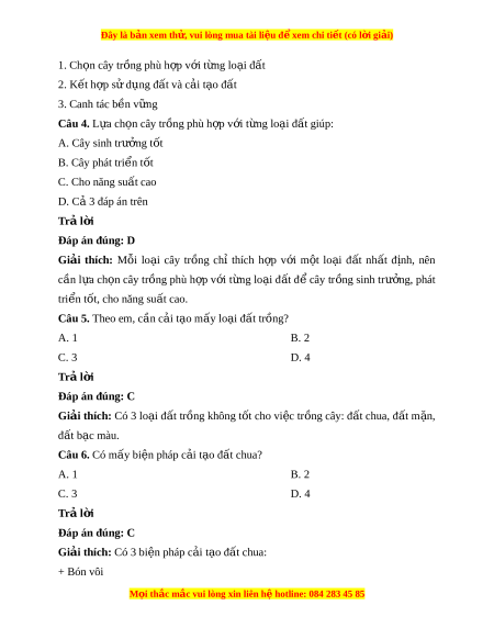 Đây là bản xem th , vu ử i lòng mua tài li u ệ đ xe ể m chi ti t (c ế ó l i ờ gi i ả ) 1. Ch n ọ cây trồng phù h p ợ v i ớ t ng l ừ o i ạ đ t ấ 2. K t ế h p ợ s d ử ng ụ đ t ấ và c i ả t o đ ạ t ấ 3. Canh tác b n v ề ng ữ Câu 4. L a ch ự n ọ cây trồng phù h p v ợ i ớ t ng ừ lo i ạ đ t ấ giúp: A. Cây sinh trư ng t ở t ố B. Cây phát tri n t ể t ố C. Cho năng su t ấ cao D. C 3 đáp án ả trên Trả l i ờ Đáp án đúng: D