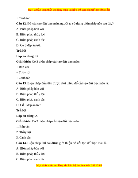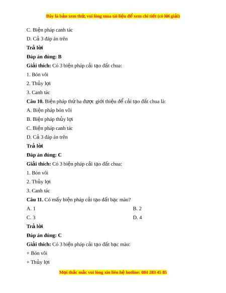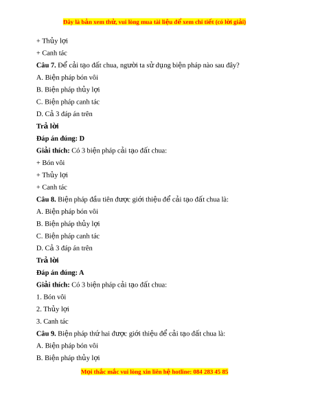 Đây là bản xem th , vu ử i lòng mua tài li u ệ đ xe ể m chi ti t (c ế ó l i ờ gi i ả ) + Th y l ủ i ợ + Canh tác Câu 7. Để c i ả t o ạ đ t ấ chua, ngư i ờ ta sử d ng bi ụ n pháp nào s ệ au đây? A. Bi n ệ pháp bón vôi B. Bi n pháp t ệ h y l ủ i ợ C. Bi n pháp canh t ệ ác D. C 3 đáp án ả trên Trả l i ờ Đáp án đúng: D