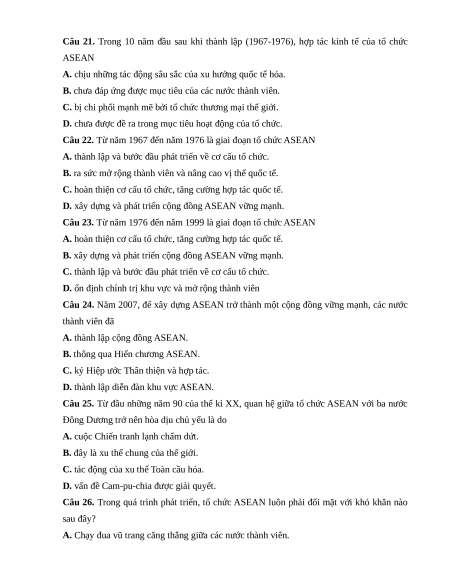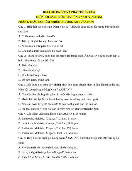 Câu 5. Hiệp hội các quốc gia Đông Nam Á (ASEAN) được thành lập năm 1967 trong bối cảnh