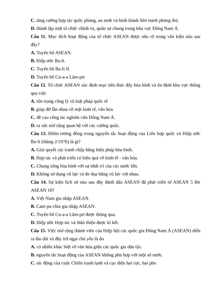 Câu 11. Mục đích hoạt động của tổ chức ASEAN được nêu rõ trong văn kiện nào sau đây? A. Tuyên bố ASEAN. B. Hiệp ước Ba-li.