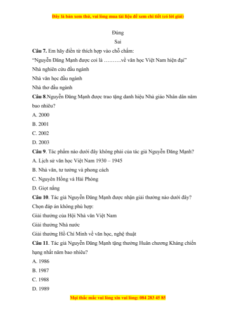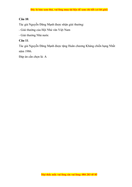 Câu 11. Tác giả Nguyễn Đăng Mạnh tặng thưởng Huân chương Kháng chiến